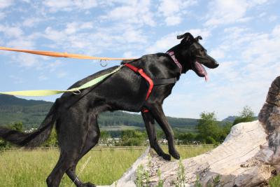 Amara liebt es, nach Futter zu suchen, sie kennt das Signal "luege", mit Handzeichen ist Sitz und Platz möglich und sie bietet selber ein "slow down" an (liegend den Kopf auf den Boden legen).